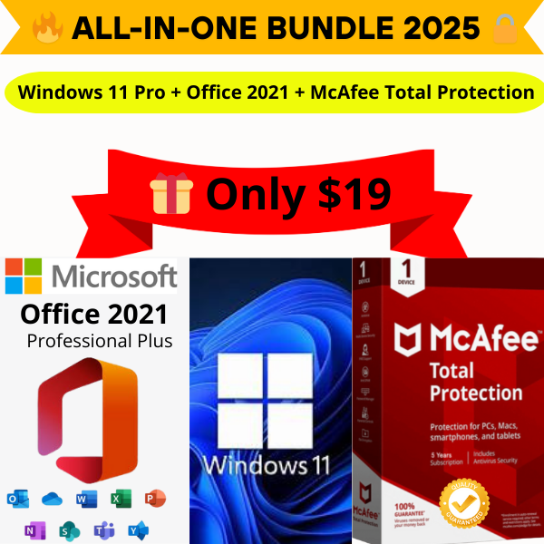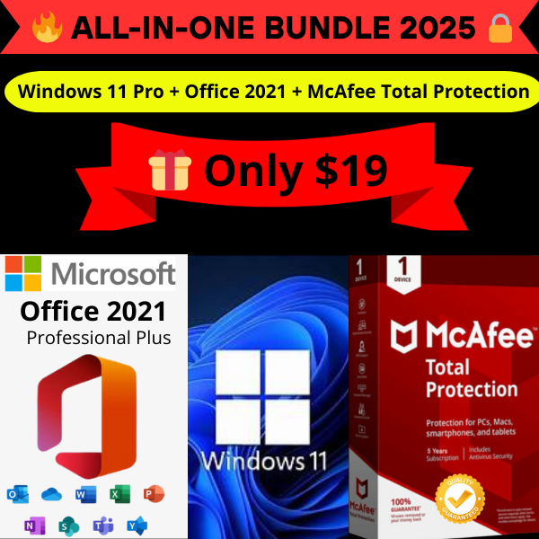 Get a complete PC upgrade with this bundle: Windows 11 Pro, Office 2021 Professional Plus, and McAfee Total Protection 10 Years — all for just $19. Instant delivery and 100% genuine keys.